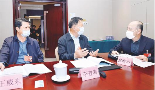 3月9日,參加山東代表團分組會議后,王威東、李登海、宮明杰(自左至右)等代表就藥品、種子、食品等安全問題展開熱烈討論。(來源大眾日報04版 記者房賢剛)