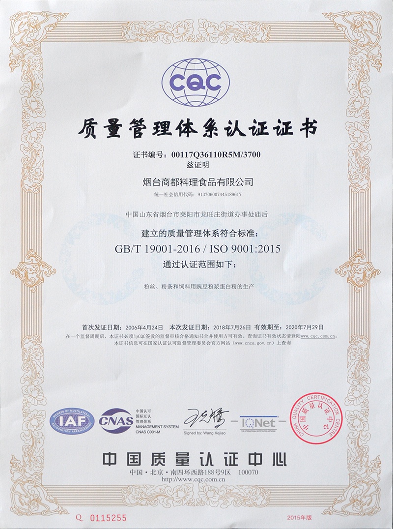 近日,CQC中國質量認證中心山東評審中心評審組在龍大食品工業園對煙臺商都料理食品有限公司進行了最新標準的ISO9001質量管理體系認證。